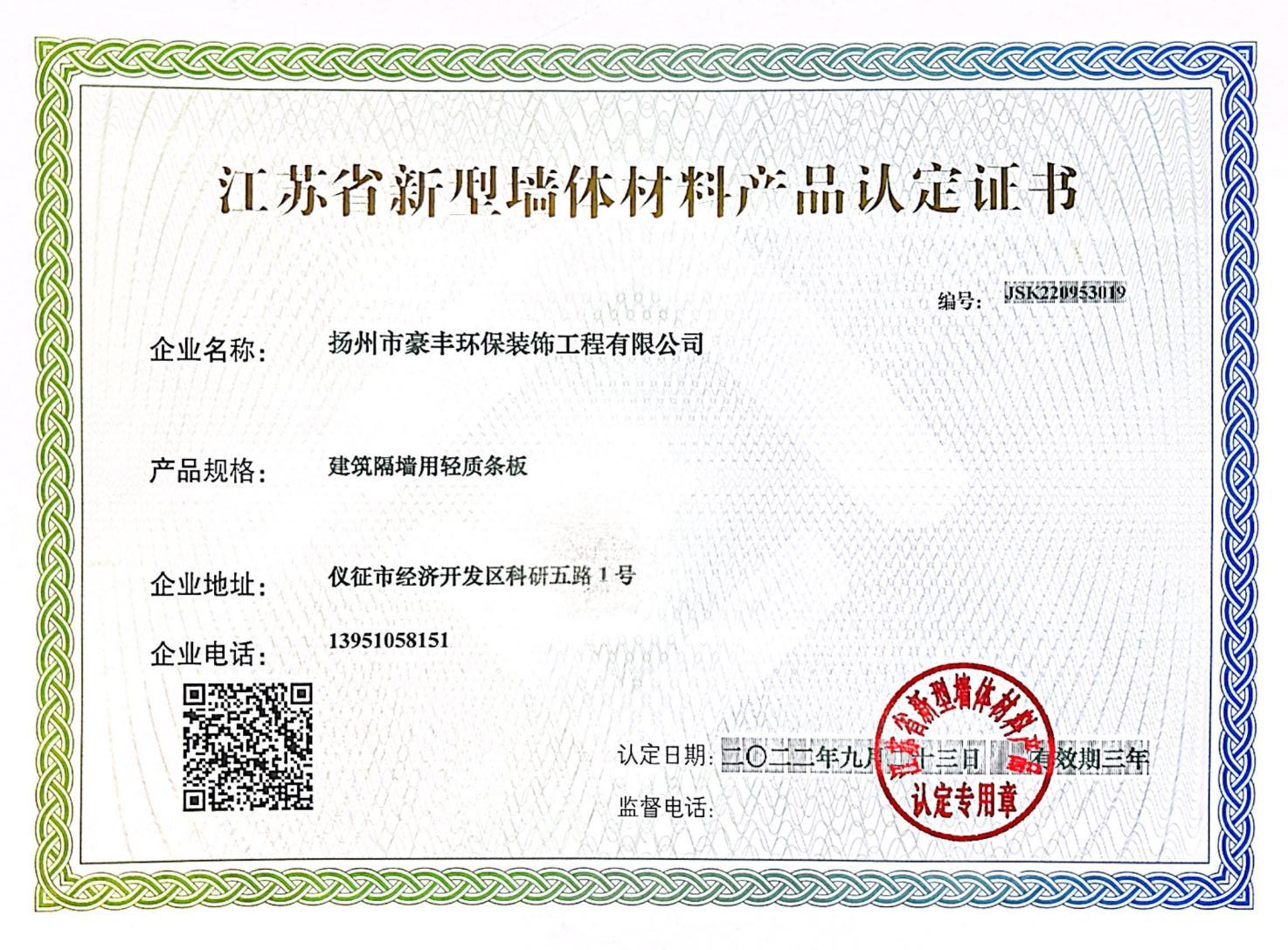 江苏省新型墙体材料产品认定证书